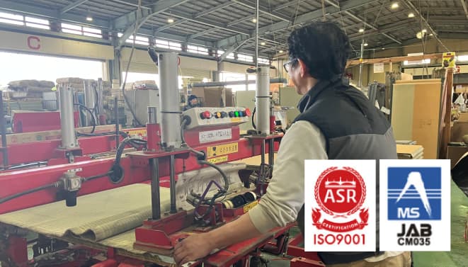三条たたみの本社工場では、ISO9001の審査登録により、厳しい品質管理のもと、年32万枚もの畳や襖の施行をさせていただいております。